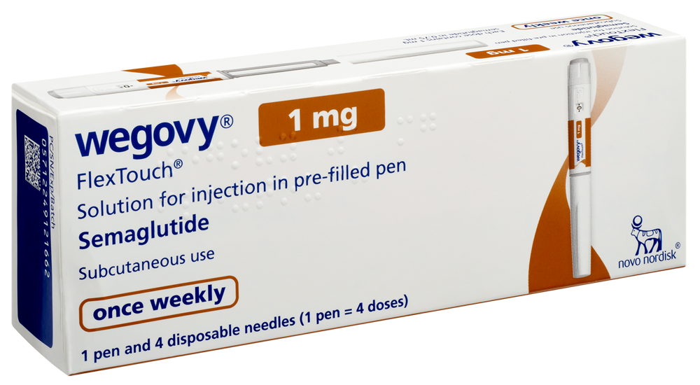 Wegovy® (semaglutide) 1 mg Pen – A GLP-1 receptor agonist indicated for chronic weight management in adults with obesity or overweight with weight-related comorbidities. Administered once weekly via a pre-filled, single-dose injection pen as part of the recommended dose escalation schedule following 0.5 mg therapy.
